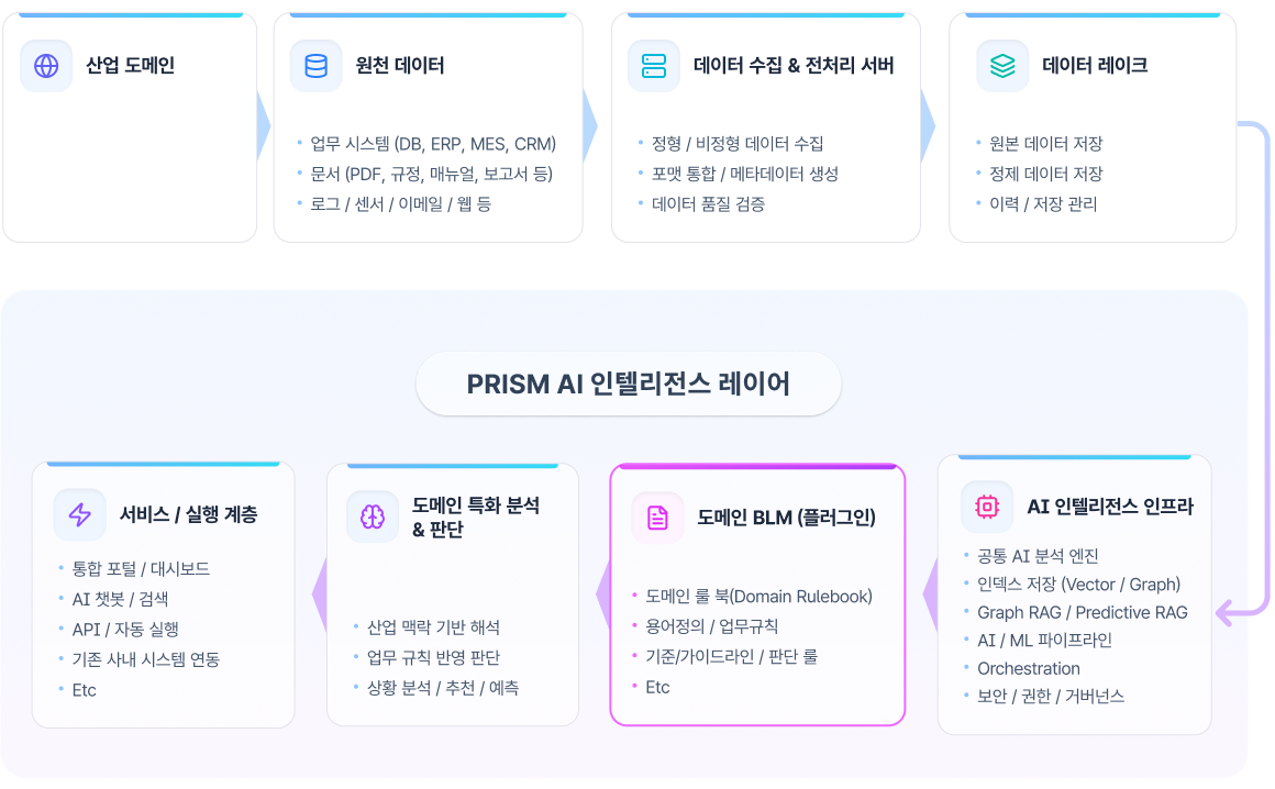 이 과정에서 PRISM은 공통 AI 인텔리전스 레이어 위에 산업별 언어와 규칙을 이해하는 BLM(비즈니스 언어 모델) 플러그인을 적용해, 각 도메인의 특성에 맞는 해석과 판단이 이루어지도록 합니다.
